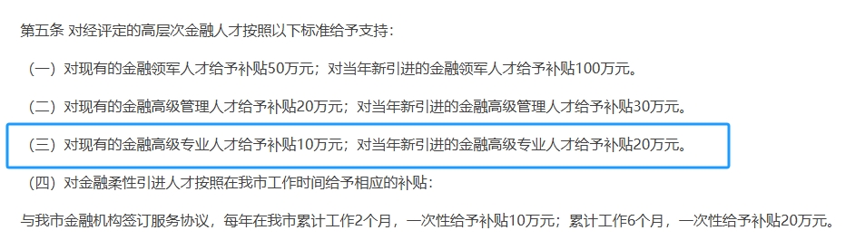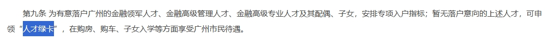 根據(jù)廣州市地方金融監(jiān)督管理局關(guān)于印發(fā)的《廣州高層次金融人才支持項目實施辦法(第二次修訂)》可知,對現(xiàn)有的金融高級專業(yè)人才給予補貼10萬元;對當年新引進的金融高級專業(yè)人才給予補貼20萬元。其配偶、子女,安排專項入戶指標;暫無落戶意向的上述人才,可申領(lǐng)“人才綠卡”,在購房、購車、子女入學等方面享受廣州市民待遇。