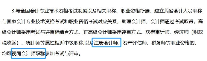 廣東省人力資源和社會保障廳、廣東省財政廳關(guān)于印發(fā)的《廣東省深化會計人員職稱制度改革實施方案》中寫到,為促進職稱制度與職業(yè)資格、人才培養(yǎng)使用相銜接,具有注冊會計師職業(yè)資格的,視同會計師職稱參加考試和評審。