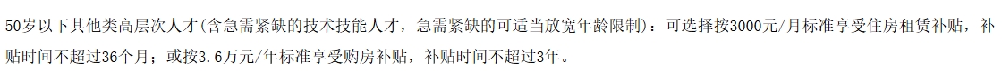 根據(jù)中共海南省委辦公廳、海南省人民政府辦公廳印發(fā)的《海南省關(guān)于引進(jìn)人才住房保障的指導(dǎo)意見(jiàn)》的通知規(guī)定,50歲以下其他類(lèi)高層次人才(含急需緊缺的技術(shù)技能人才,急需緊缺的可適當(dāng)放寬年齡限制):可選擇按3000元/月標(biāo)準(zhǔn)享受住房租賃補(bǔ)貼,補(bǔ)貼時(shí)間不超過(guò)36個(gè)月;或按3.6萬(wàn)元/年標(biāo)準(zhǔn)享受購(gòu)房補(bǔ)貼,補(bǔ)貼時(shí)間不超過(guò)3年。