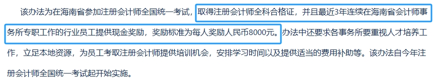 《海南省注冊(cè)會(huì)計(jì)師行業(yè)關(guān)于鼓勵(lì)從業(yè)人員考取注冊(cè)會(huì)計(jì)師資格的獎(jiǎng)勵(lì)暫行辦法》規(guī)定,在海南省參加注冊(cè)會(huì)計(jì)師全國(guó)統(tǒng)一考試,取得注冊(cè)會(huì)計(jì)師全科合格證,并且最近3年連續(xù)在海南省會(huì)計(jì)師事務(wù)所專(zhuān)職工作的行業(yè)員工提供現(xiàn)金獎(jiǎng)勵(lì),獎(jiǎng)勵(lì)標(biāo)準(zhǔn)為每人獎(jiǎng)勵(lì)人民幣8000元。