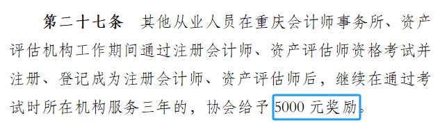重慶市注冊會計師協(xié)會發(fā)布的《重慶市注冊會計師行業(yè)、資產(chǎn)評估行業(yè)人才培養(yǎng)辦法》規(guī)定,在重慶會計師事務(wù)所、資產(chǎn)評估機構(gòu)工作期間通過注冊會計師考試并注冊、登記成為注冊會計師的人員,繼續(xù)在通過考試時所在機構(gòu)服務(wù)三年的,協(xié)會給予5000元獎勵。