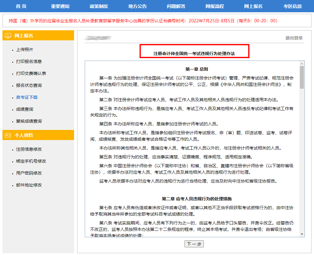 閱讀《注冊會計師全國統(tǒng)一考試違規(guī)行為處理辦法》,在仔細看過后點擊“下一步”;