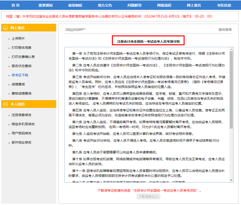 點擊“準考證打印”,閱讀考場守則后點擊“下載準考證”。