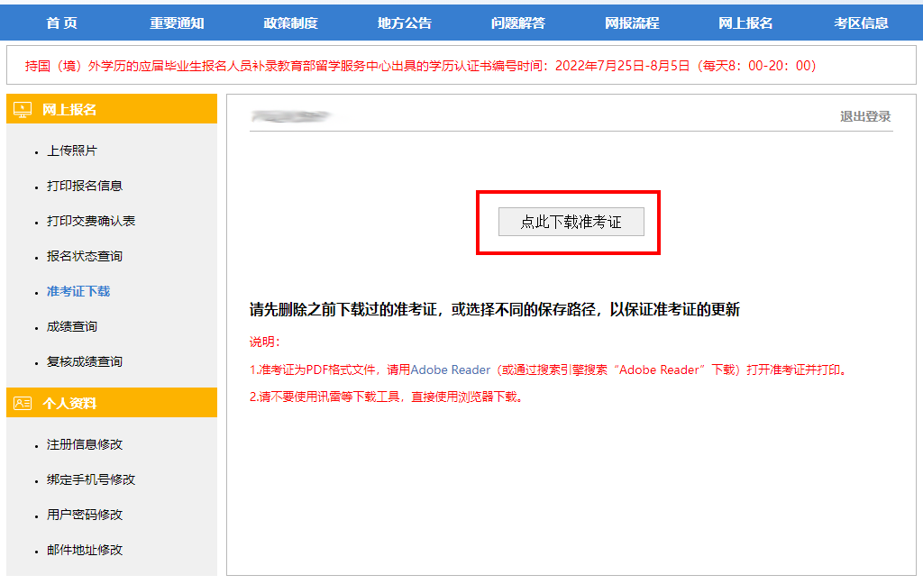 點擊“準考證打印”