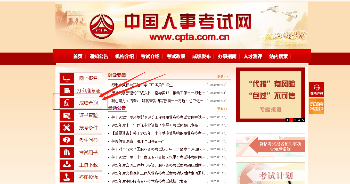 2022年中級經(jīng)濟師考試成績在中國人事考試網(wǎng)查詢,網(wǎng)址為http://www.cpta.com.cn/,中級經(jīng)濟師成績查詢時間預(yù)計在23年1月,考生可以在考試結(jié)束后關(guān)注中國人事考試網(wǎng)及所在地區(qū)的官方通知,成績查詢通道在進入中國考試網(wǎng)之后可看到左側(cè)“成績查詢”欄目,如圖所示: