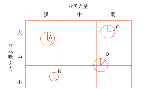 這個地帶的行業(yè)吸引力偏小,戰(zhàn)略業(yè)務單位的業(yè)務力量偏弱。因此,企業(yè)對這個地帶的戰(zhàn)略業(yè)務單位(圖中D)要“開紅燈”,采取收割或放棄的戰(zhàn)略。