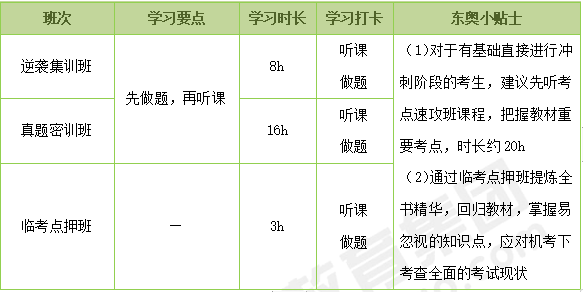 聽課任務(wù):逆襲集訓(xùn)班+真題密訓(xùn)班+臨考點(diǎn)押班等。