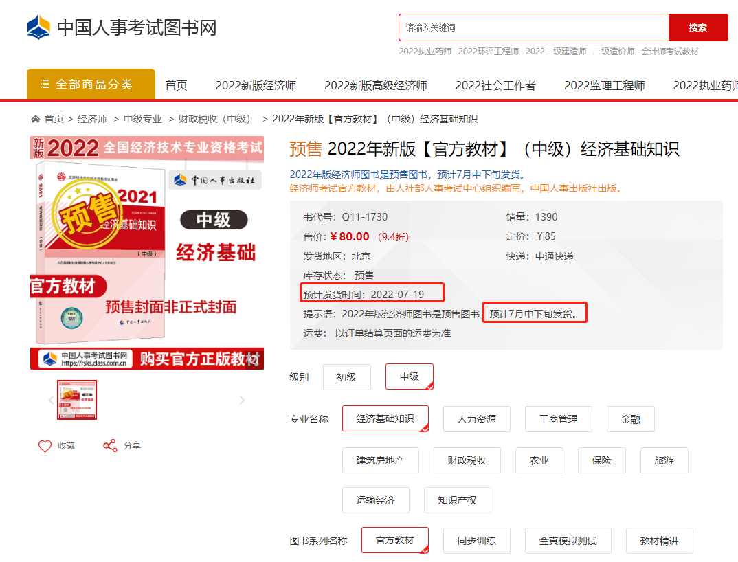 根據(jù)中國人事考試圖書網(wǎng)最新的消息,2022中級經(jīng)濟(jì)師考試官方教材已經(jīng)開始預(yù)售,并預(yù)計7月19日正式發(fā)貨。中級經(jīng)濟(jì)師考試用書由人社部人事考試中心組織編寫,中國人事出版社出版