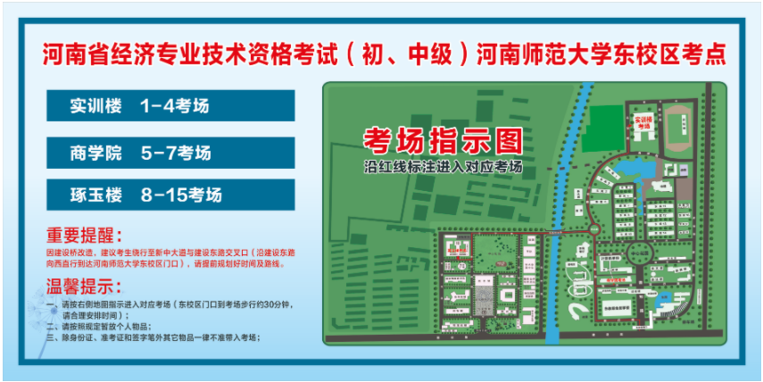 河南考區(qū)2022年中級經濟師補考的同學們請注意,河南人事考試中心發(fā)布了“河南新鄉(xiāng)市河南師范大學(東校區(qū))考點考生友情提示”,其中說明“因建設路與牧野路交叉口建設橋正在施工中,道路不通”等重要的路況信息,,并提示大家提前到達考場,具體如下。