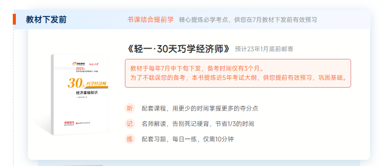 教材下發(fā)前可利用《輕一·30天巧學(xué)經(jīng)濟(jì)師》預(yù)習(xí),通過(guò)“聽(tīng)、記、練”鞏固基礎(chǔ):