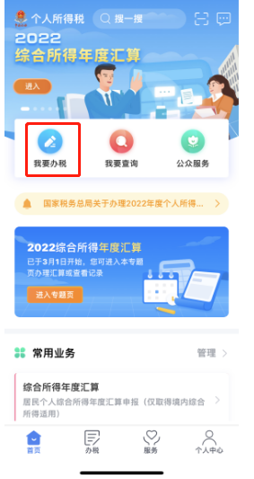 首先同學(xué)們需要用手機(jī)下載名為“個(gè)人所得稅”的APP,下載完成后點(diǎn)擊“我要辦稅”(注意:如果第一次下載需要先注冊(cè)賬號(hào)):