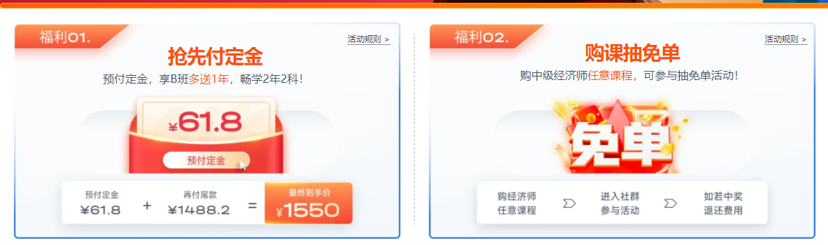 購課抽免單:購中級經(jīng)濟師任意課程,可參與抽免單活動!