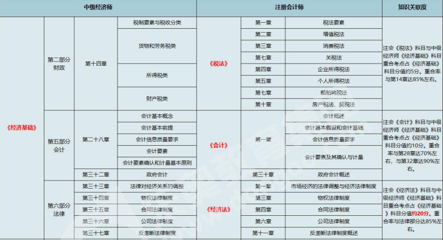 中級經(jīng)濟師與CPA的重疊相對比較高,例如經(jīng)濟基礎(chǔ)知識與注會的稅法知識點,財政稅收與稅法的知識點都有較高的重疊度,同時備考效率更高。下面請參考由東奧會計在線老師整理的關(guān)于“中級經(jīng)濟師與CPA知識點重合度”的對比表格,點擊可查看大圖: