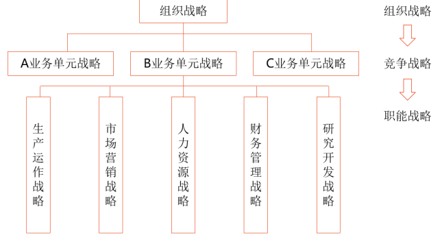 一個(gè)組織的戰(zhàn)略通常包括三個(gè)層次:組織戰(zhàn)略層次、競(jìng)爭(zhēng)戰(zhàn)略層次、職能戰(zhàn)略層次。