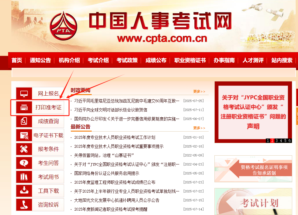 訪問(wèn)中國(guó)人事考試網(wǎng)(http://www.cpta.com.cn),點(diǎn)擊首頁(yè)左側(cè)導(dǎo)航欄的“打印準(zhǔn)考證”按鈕。