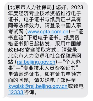 【北京市人力社保局】您好,2023年度經(jīng)濟專業(yè)技術(shù)資格推行電子證書,電子證書與紙質(zhì)證書具有同等法律效力,請登錄中國人事考試網(wǎng)(https://www.cpta.com.cn)—“證書查驗”下載電子證書。紙質(zhì)資格證書即日起核發(fā),采用中國郵政EMS寄遞領(lǐng)取方式。請登錄北京市人力資源和社會保障局網(wǎng)站(rsj.beijing.gov.cn)—“個人辦事”—“專業(yè)技術(shù)人員資格證書”申請寄遞證書。如有證書申領(lǐng)方面的問題,請發(fā)送電子郵件至kwglsk@rsj.beijing.gov.cn或致電12333咨詢。