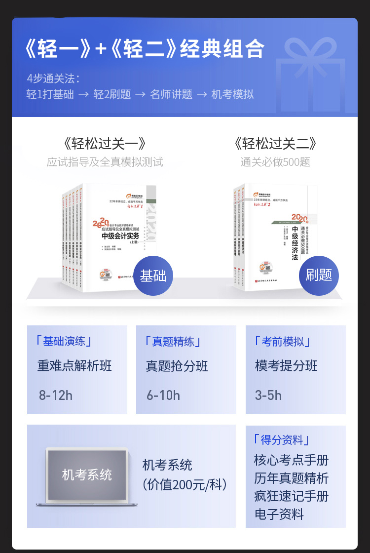 考證以來(lái)都是用的輕一從初級(jí)到中級(jí)對(duì)我來(lái)說(shuō)輕一是非常的全面的,同時(shí)又有歷年真題和章節(jié)練習(xí),單靠輕一拿下中級(jí)完全沒(méi)問(wèn)題??
