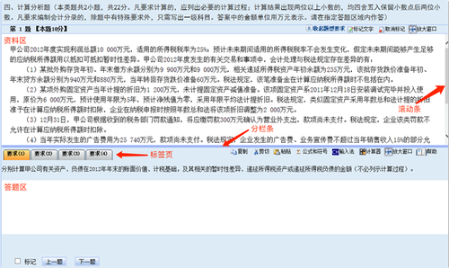 (1) 計(jì)算分析題、簡(jiǎn)答題、綜合題都是上下分欄,上欄為資料區(qū),下欄為答題區(qū)??忌筛鶕?jù)需要上下拖動(dòng)分欄條和右側(cè)滾動(dòng)條,調(diào)整資料區(qū)或答題區(qū)的可視區(qū)域。答題區(qū)根據(jù)考試題目要求分為“要求(1)”、“要求(2)”、“要求(3)”等多項(xiàng)標(biāo)簽頁(yè)??忌凑找笤诟髯源痤}區(qū)域內(nèi)進(jìn)行答題。