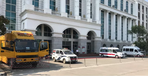 考場(chǎng)外待命的發(fā)電車、警車、救護(hù)車和無線監(jiān)測(cè)車
