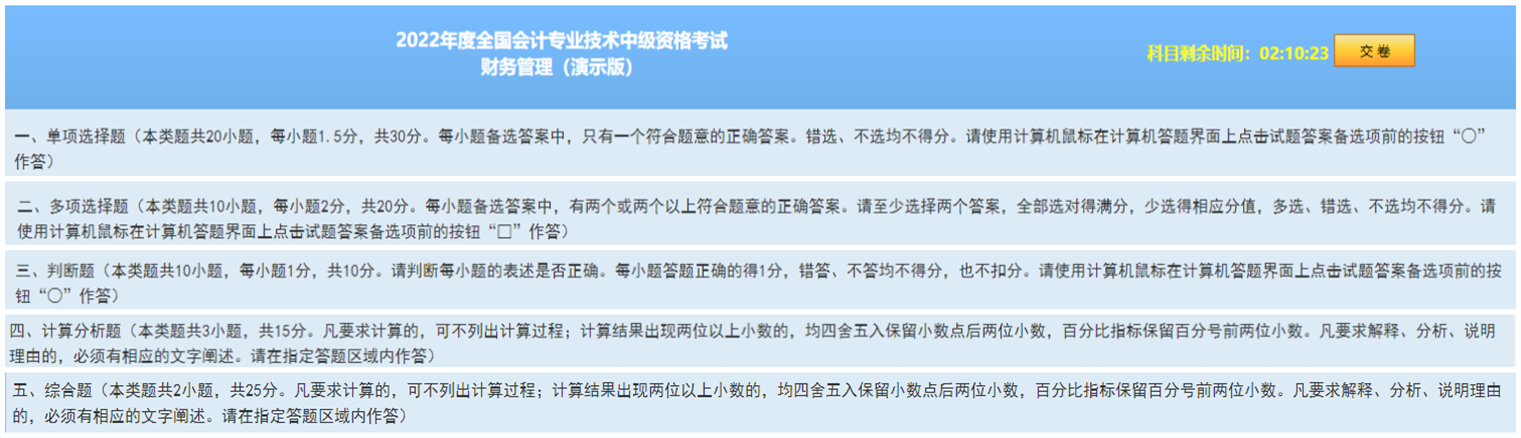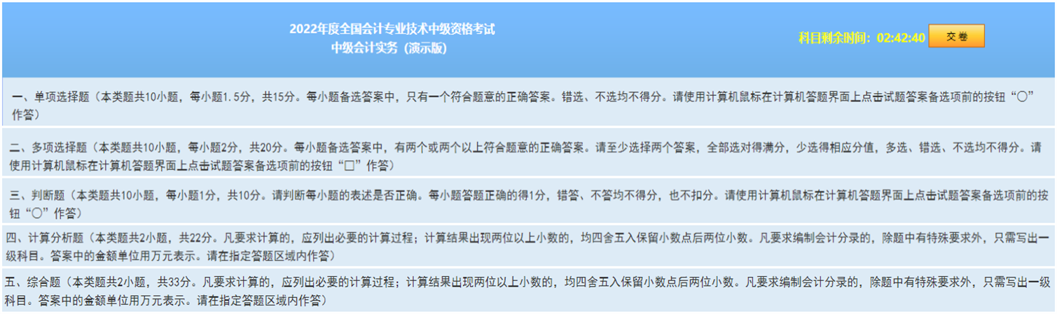 2022年中級會計(jì)職稱考試題型及題量已經(jīng)在全國會計(jì)資格評價(jià)網(wǎng)發(fā)布了,在“全國會計(jì)專業(yè)技術(shù)資格無紙化考試操作說明、答題演示、模擬答題系統(tǒng)”中可以清楚的看到相關(guān)內(nèi)容,東奧會計(jì)在線特為大家進(jìn)行了整理!