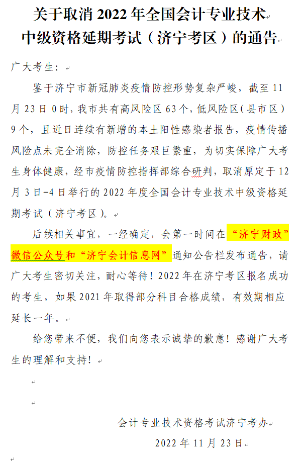 山東省濟寧市2022年中級會計延期考試取消通告