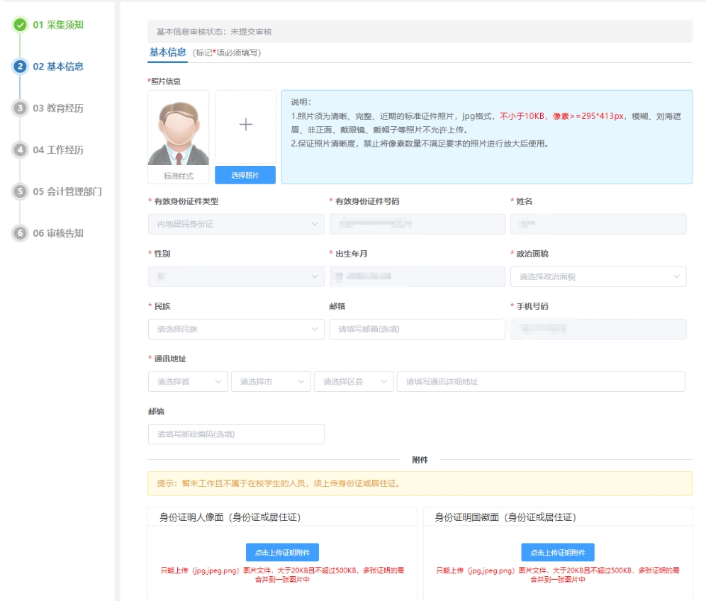 基本信息采集須知頁點(diǎn)擊下一步進(jìn)入到基本信息頁。在基本信息頁中需要上傳清晰、完整、近期的標(biāo)準(zhǔn)證件照片,并且要求不小于 10KB,像素>=295*413px,請(qǐng)仔細(xì)閱讀上傳照片框右側(cè)的說明?;拘畔⒅杏行矸葑C件類型、有效身份證件號(hào)碼、姓名、性別、出生年月以及手機(jī)號(hào)碼為注冊(cè)時(shí)所填信息,基本信息頁不可修改。在填寫完整基本信息后點(diǎn)擊下一步,進(jìn)入到教育經(jīng)歷頁。