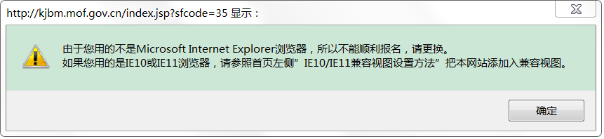 首先要保證使用的是IE瀏覽器登錄,否則會(huì)在進(jìn)入各城市報(bào)名頁面時(shí),出現(xiàn)以下提示: