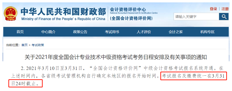 2021年中級會計考試報名時間是3月10日至31日,報名及繳費截止時間是3月31日24時。