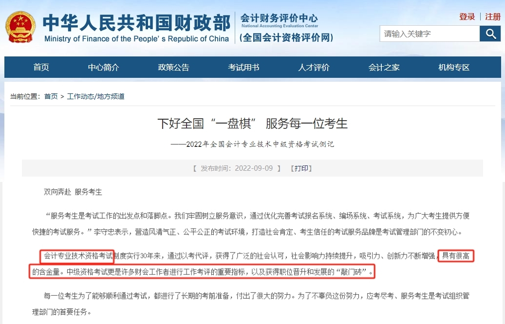 財(cái)政部在2022年發(fā)布的《下好全國“一盤棋” 服務(wù)每一位考生——2022年全國會計(jì)專業(yè)技術(shù)中級資格考試側(cè)記》文章中明確指出:會計(jì)專業(yè)技術(shù)資格具有很高的含金量,中級資格考試更是獲得職位晉升和發(fā)展的“敲門磚”!