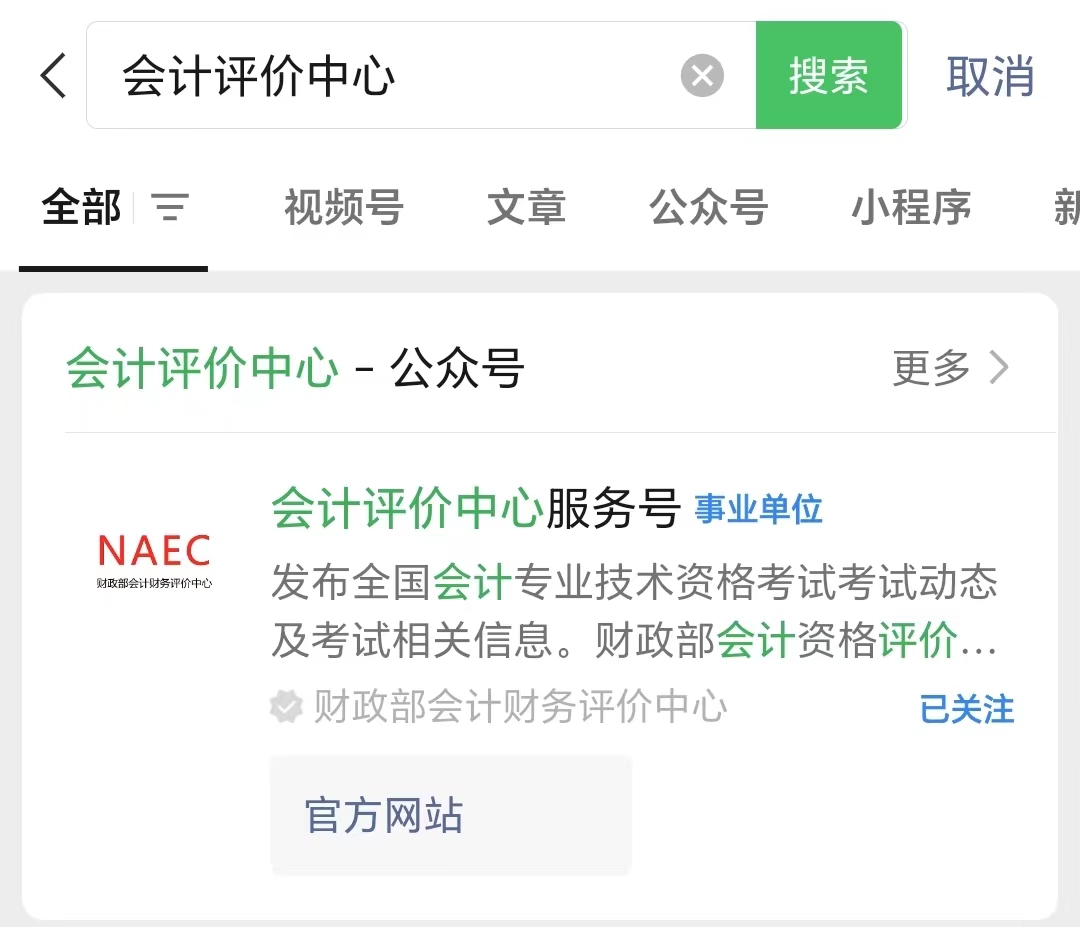 ①手機(jī)微信右上角搜索“會計評價中心服務(wù)號”