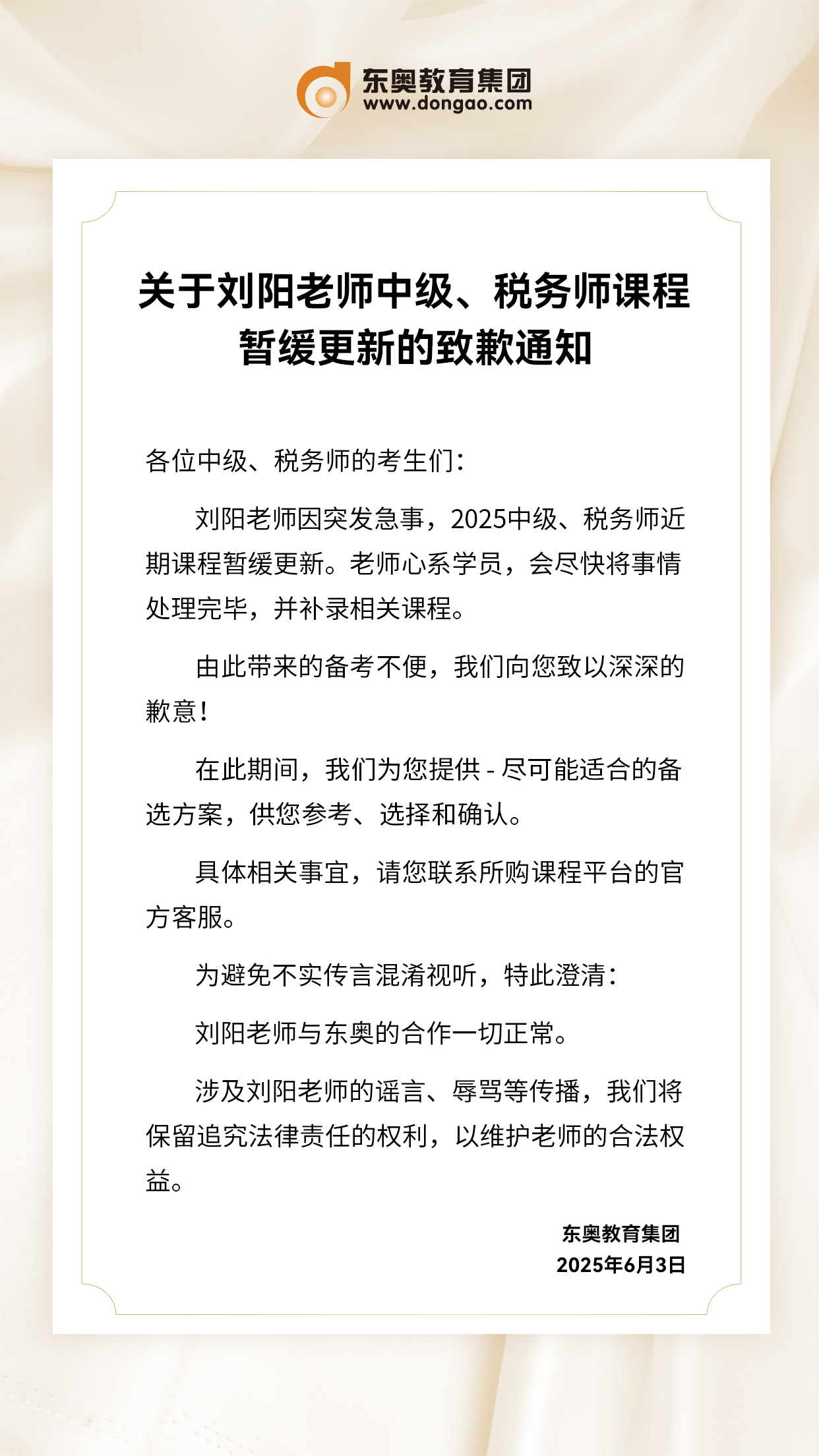 關于劉陽老師中級、稅務師課程暫緩更新的致歉通知