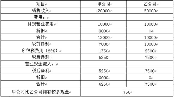 假設(shè)有甲公司和乙公司,全年銷貨收入、付現(xiàn)費(fèi)用均相同,所得稅稅率為25%。兩者的區(qū)別是甲公司有一項(xiàng)可計(jì)提折舊的資產(chǎn),每年折舊額相同。兩家公司的現(xiàn)金流量如下表所示。