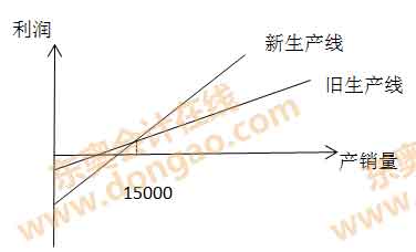 老師您好:我不明白為什么生產(chǎn)量低于15000件時(shí),采用原來(lái)的生產(chǎn)線獲利多;當(dāng)高于銷(xiāo)量15000時(shí)采用新生產(chǎn)線。