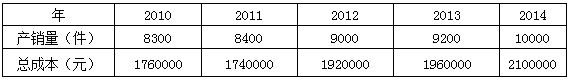 A企業(yè)只生產(chǎn)銷售甲產(chǎn)品。該企業(yè)2014年產(chǎn)量及銷量均為10000件,單位售價(jià)為900元/件,變動(dòng)成本為3000000元,固定成本為700000元,混合成本為2100000元。以前年度的混合成本和產(chǎn)銷量資料如下表所示: