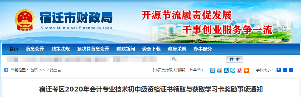 宿遷考區(qū)2020年會計專業(yè)技術(shù)初中級資格證書領(lǐng)取與獲取學(xué)習(xí)卡獎勵事項通知