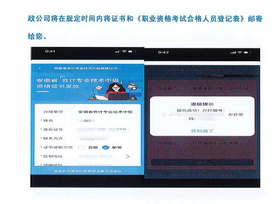 1.線上郵寄發(fā)證。2022年3月8日至4月8日,資格審核合格人員可登錄皖事通APP,通過消息欄點擊證書發(fā)放信息,進入證書發(fā)放系統(tǒng),填寫郵遞地址、聯(lián)系方式等信息,EMS可免費郵遞送達。同時,也可通過長三角政務(wù)地圖搜索“安徽省會計專業(yè)技術(shù)中級資格證書發(fā)放”,選擇“毫州市”,點擊掌上辦申請證書發(fā)放。(附件:操作流程圖)