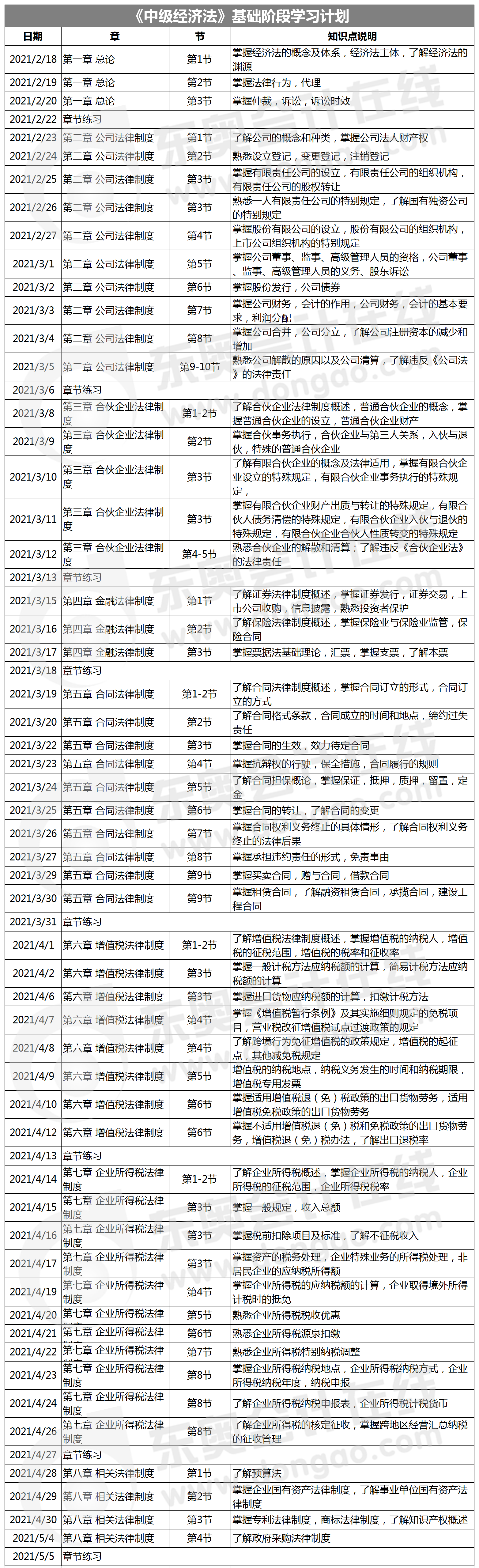 2021年基礎(chǔ)階段學習計劃(中級經(jīng)濟法)