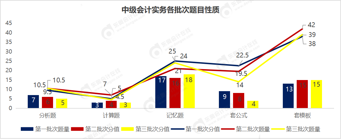 從以上的題目性質(zhì)看,三個(gè)批次題目結(jié)構(gòu)是比較相同的,題量上記憶題題量最大,考查的分?jǐn)?shù)上套模板題目的考查分?jǐn)?shù)最多。計(jì)算題題量和分值占比都是最少的。因此想要在中級(jí)會(huì)計(jì)實(shí)務(wù)考試中取得好成績,對(duì)于基礎(chǔ)知識(shí)點(diǎn)的掌握是非常必要的,同時(shí)要多做類型題來進(jìn)行鞏固。
