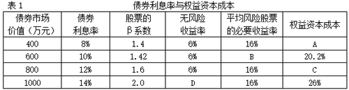 【綜合題1】某公司息前稅前利潤為600萬元,公司適用的所得稅稅率為25%,公司目前賬面總資金為2000萬元,其中80%由普通股資金構(gòu)成,股票賬面價值為1600萬元,20%由債券資金構(gòu)成,債券賬面價值為400萬元,假設(shè)債券市場價值與其賬面價值基本一致。該公司認為目前的資本結(jié)構(gòu)不夠合理,準(zhǔn)備用發(fā)行債券購回股票的辦法予以調(diào)整。經(jīng)咨詢調(diào)查,目前債券利息率和權(quán)益資金的成本情況見表1: