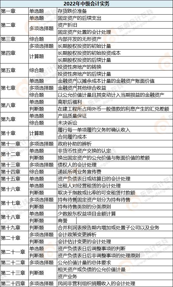 2022年中級會計實務各章節(jié)考試題型分布情況_第二批次