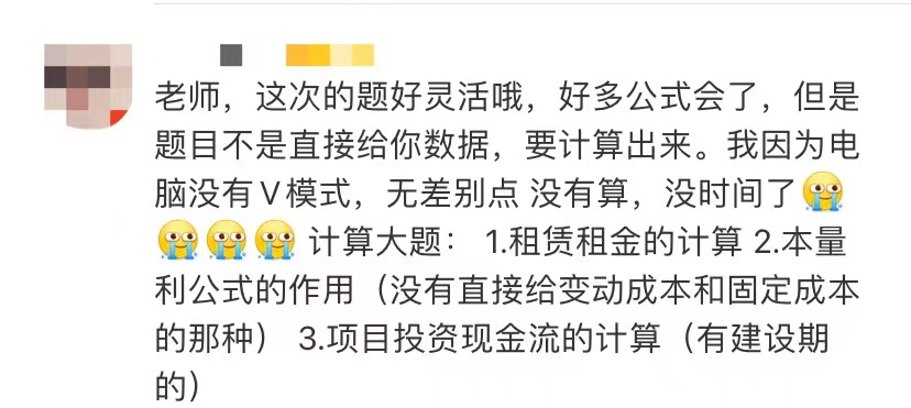 根據(jù)考生的反饋得知,《財(cái)務(wù)管理》考查了租賃租金的計(jì)算、本量公式的作用、項(xiàng)目投資現(xiàn)金流的計(jì)算等內(nèi)容!希望接下來(lái)參加考試的考生能夠重視起來(lái),認(rèn)真?zhèn)淇?,?zhēng)取學(xué)會(huì)、答對(duì)!