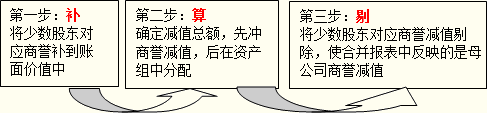 資料給出的子公司的可收回金額通常為整個子公司的可收回金額,該可收回金額既包含母公司購買部分所產(chǎn)生的商譽,也包括了少數(shù)股東的商譽,所以在計算減值金額時,應(yīng)先推算出少數(shù)股東的商譽,以總的商譽價值加上子公司可辨認(rèn)凈資產(chǎn)賬面價值作為子公司調(diào)整后的賬面價值,并以此賬面價值和可收回金額比較,進(jìn)而確認(rèn)整體的減值損失金額。如下圖所示: